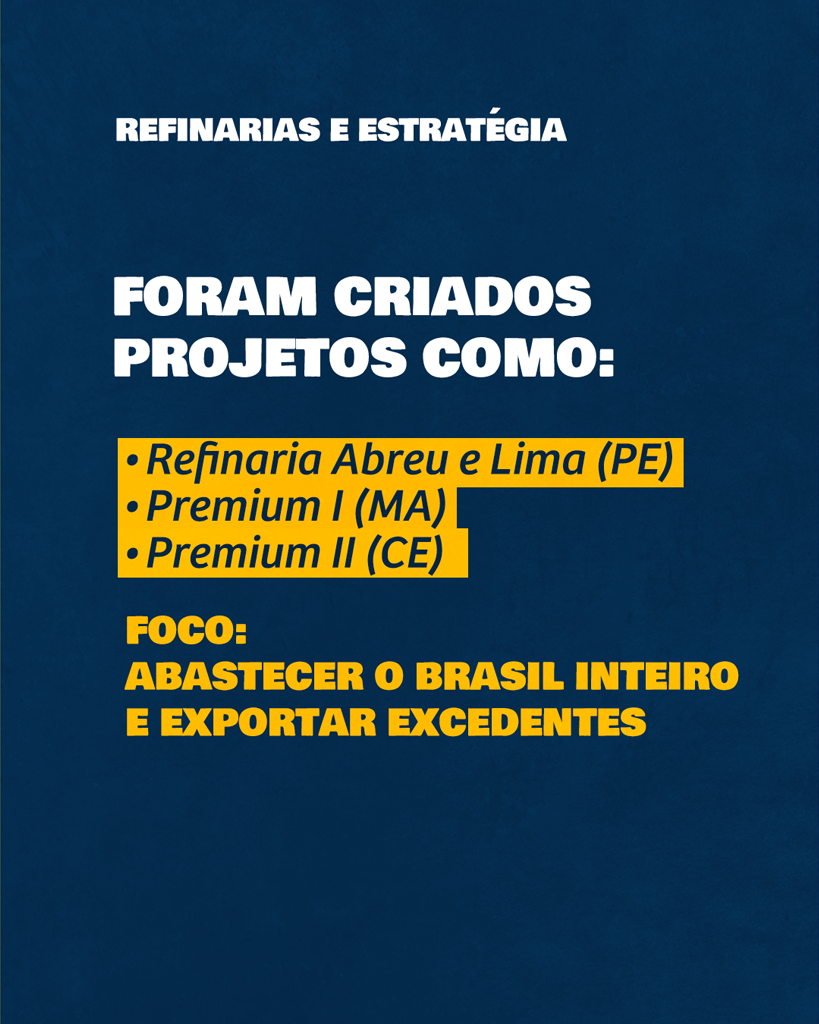 Nesse contexto surgiram projetos estruturantes como a Refinaria Abreu e Lima (Rnest), em Pernambuco, e as refinarias Premium I, no Maranhão, e Premium II, no Ceará. A localização no Nordeste não era casual: visava atender o mercado interno, ampliando a oferta no Norte e Nordeste, permitindo a exportação dos excedentes para a América do Norte e a Europa. Tratava-se de um projeto de soberania energética e desenvolvimento industrial.