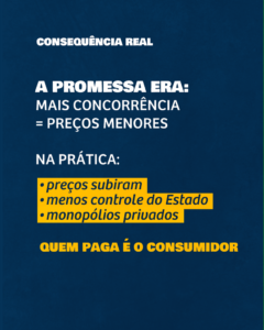 Apresentado como modernização para ampliar a concorrência e reduzir preços, o resultado, na prática, foi a alta e descontrole dos preços, espoliando o consumidor. Os efeitos são visíveis na distribuição e comercialização do gás de cozinha, dos derivados nas refinarias privatizadas e nos postos de abastecimento.
